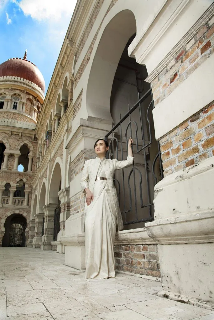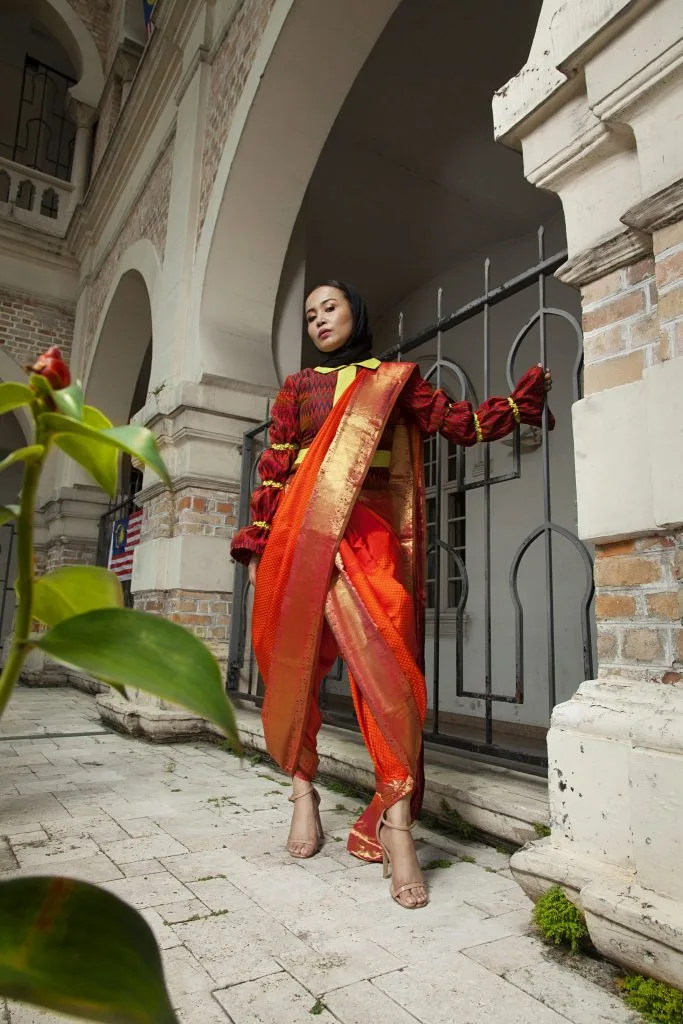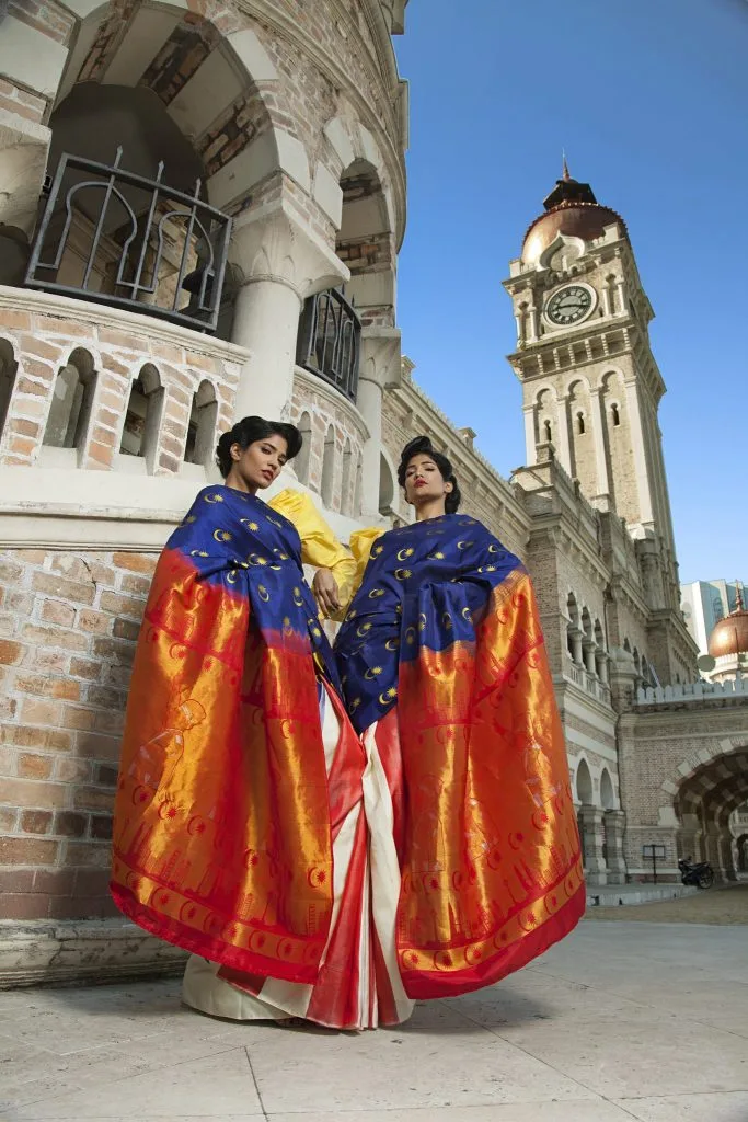 Pavithra’s inspiration and artwork on the merdeka saree was meticulously constructed and weaved by the finest weavers in Kanchipuram, India.