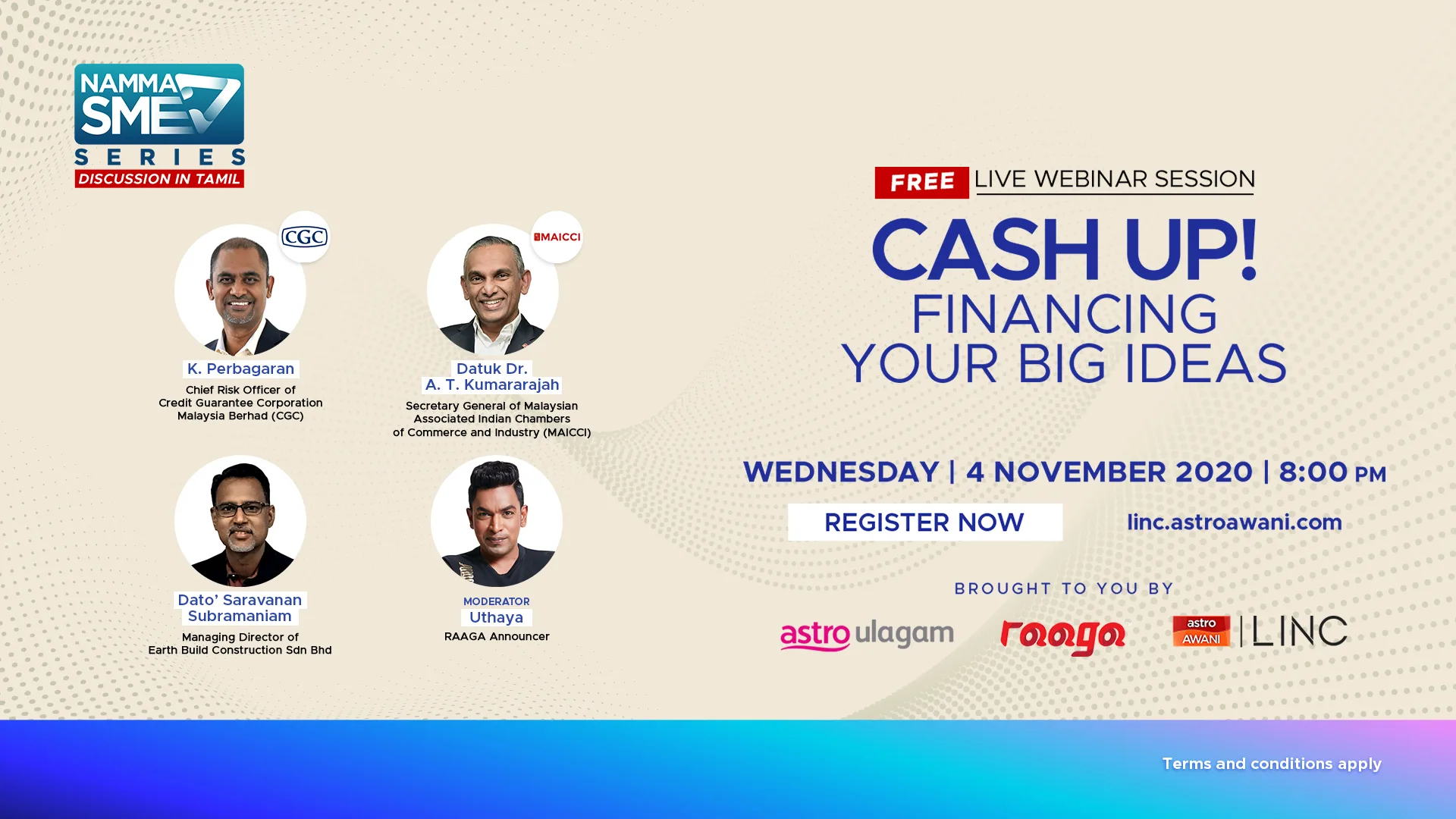 This webinar organised by Astro Ulagam, RAAGA radio and Astro AWANI, will be moderated by Uthaya, RAAGA announcer, with all discussions held entirely in Tamil.