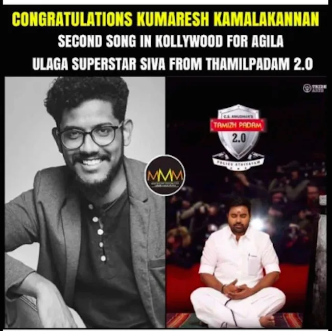 He made his Kollywood debut with famous musician D.Imman, and now his next Kollywood song is in Tamizh Padam 2.0, the most awaited comedy this year.