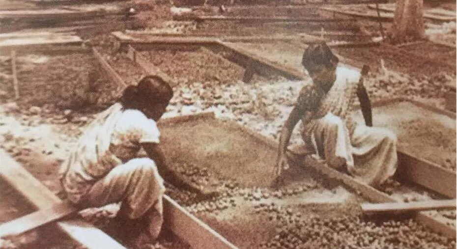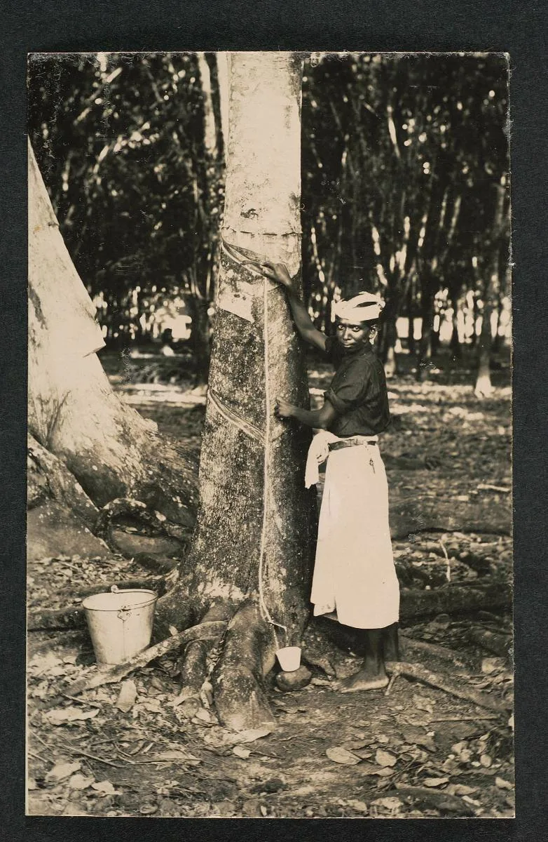 During the planting process, the women are seen using their hands to plant the rubber seeds. The female labourers seen wearing their pith helmets (sola topees) were under the supervision of white plantation bosses, dressed in white. Thus, millions of rubber trees were grown.