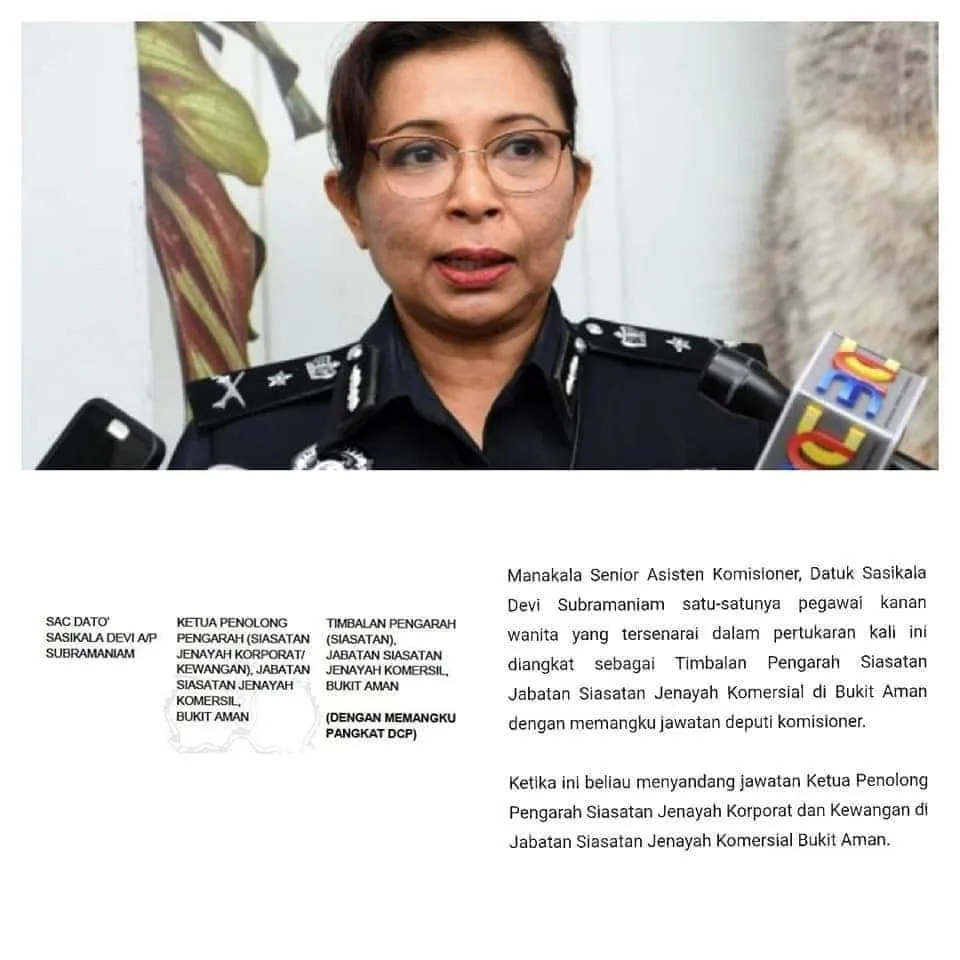 Previously, she served as Senior Assistant Commissioner (SAC) of Police while holding other posts such as Bukit Aman CCID deputy director.