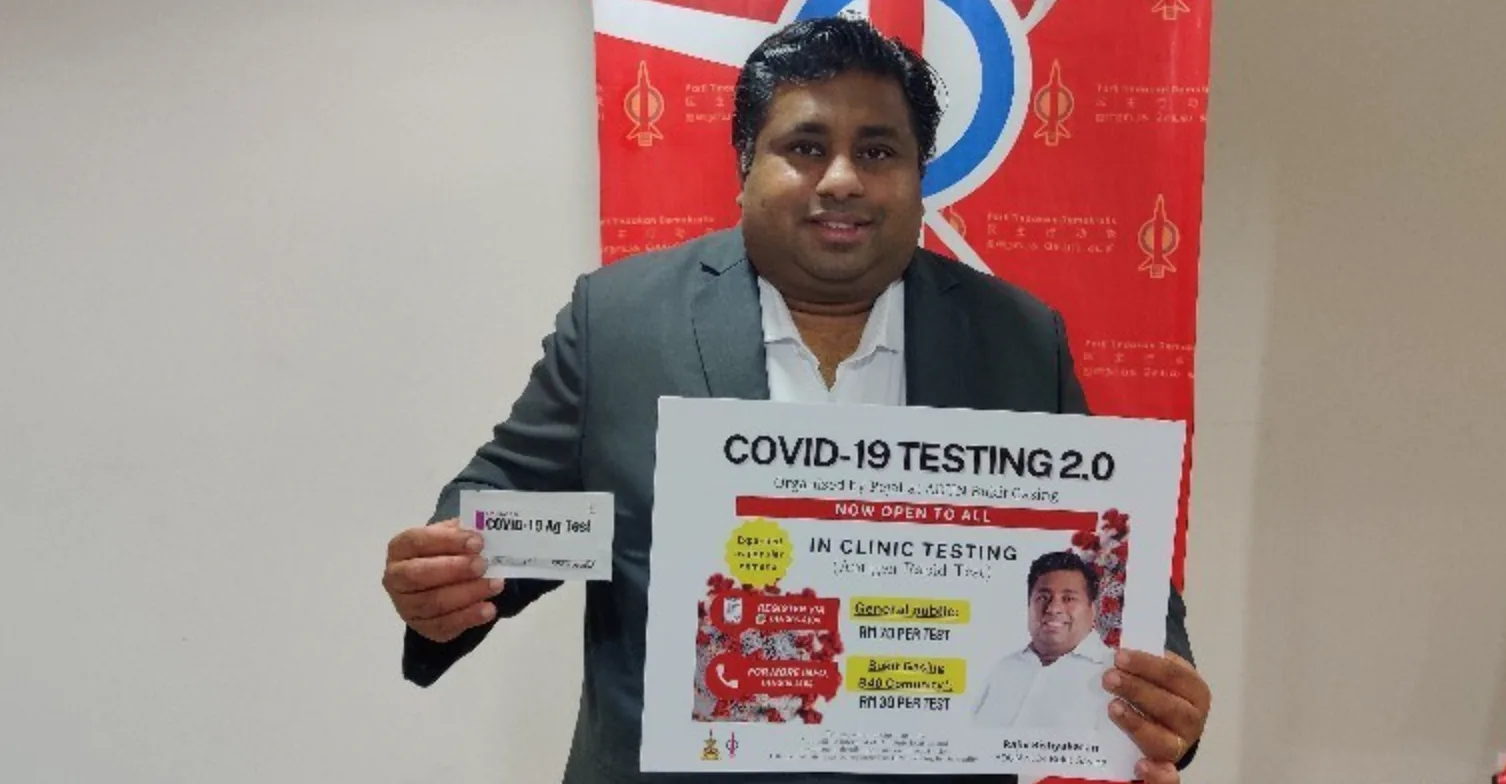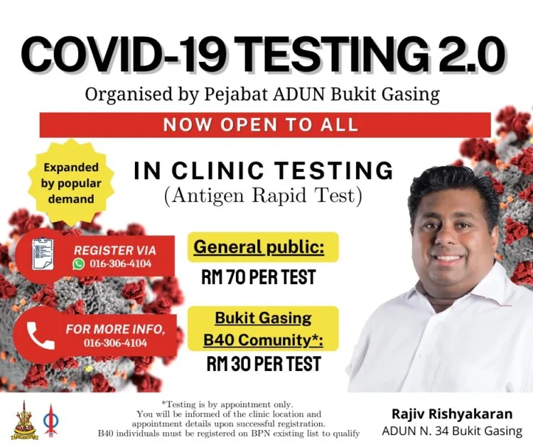 Bukit Gasing assemblyman Rajiv Rishyakaran announced that his office is making private Covid-19 tests open to the public for a discounted price of RM70. The tests previously available for Bukit Gasing residents, uses the Ministry of Health (MoH) approved Antigen rapid test (RTK-AG) kits and beats the existing price at private testing facilities of RM150 to RM180 per test.