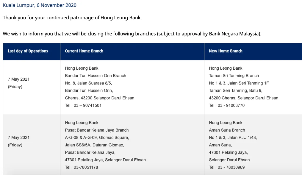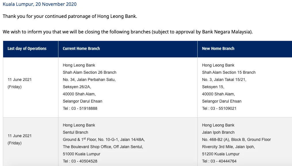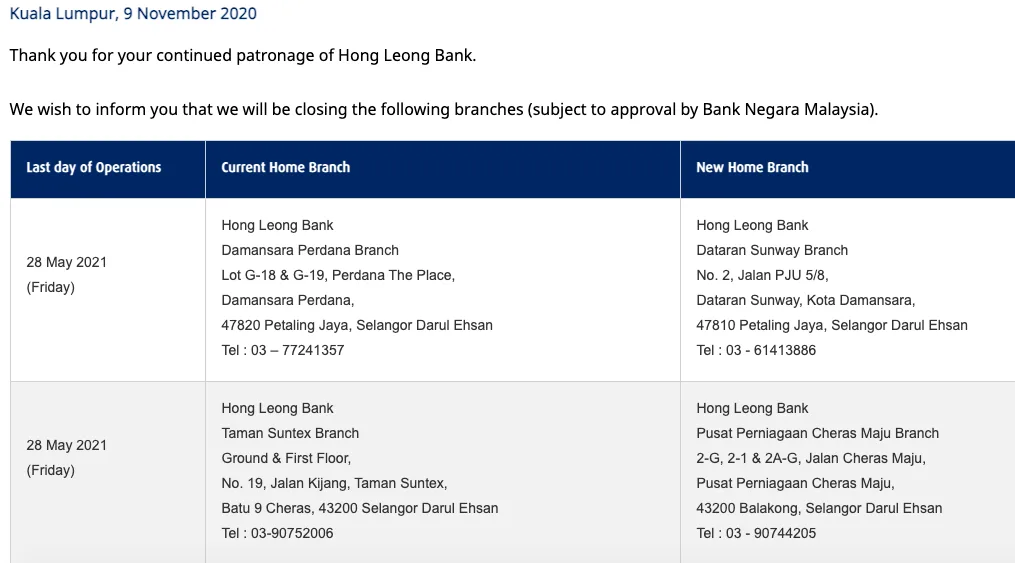 Having said that, the closure of the Hong Leong Bank branches referred to above is still being finalised at the time of writing, as it needs the approval from Bank Negara Malaysia.