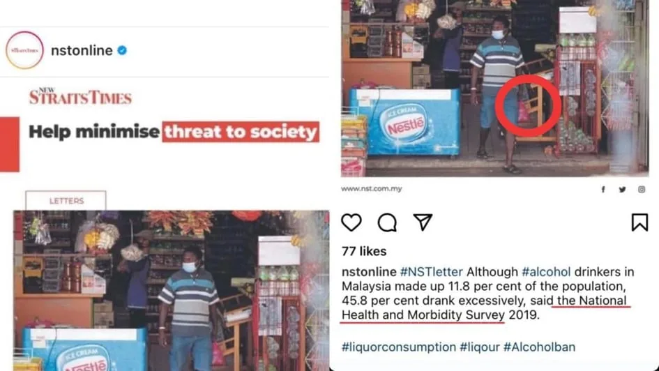 A few hours ago New Straits Times (NST) had headlined an article titled, ‘Help Minimise Threat To Society’ which referred to a study by the National Health and Morbidity Survey 2019 that stated alcohol drinkers in Malaysia made up 11.8% of the population and 45.8% drank excessively. This content had an image of an Indian middle-aged man as its feature image.