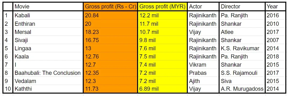 The 10 highest grossing Tamil movies mostly consist of Rajinikanth movies — an astounding 50%. In fact, if it wasn’t for Vijay’s Mersal, the top 5 spots would be all Rajinikanth movies. But as it stands, Vijay’s biggest hit to date holds the 3rd place trophy Oreo cookie. Vijay has one other movie in the top 10, which is Kaththi, directed by A.R. Murugadoss. Vikram, Ajith and Prabas each have one movie in the Top 10.