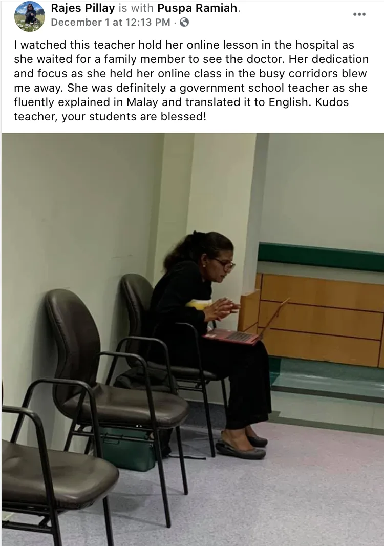 The post was uploaded and shared by Facebook user Rajes Pillay who watched Puspa in the hospital who held her online class as she was waiting for a family member to see the doctor. Rajes then goes on and says that she watched the teacher in a busy hospital corridor, to which her dedication and focus on teaching was unwavering.