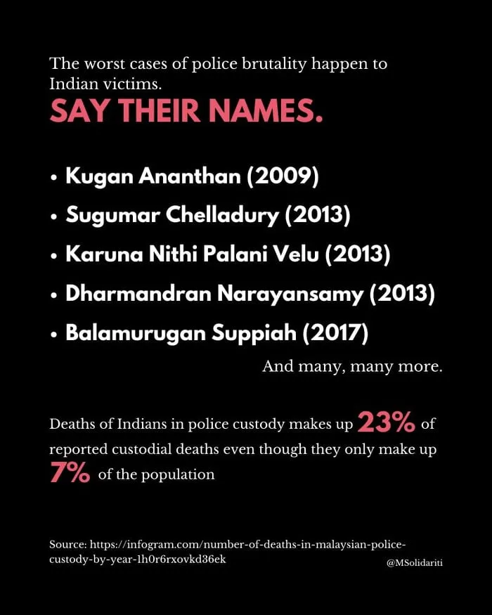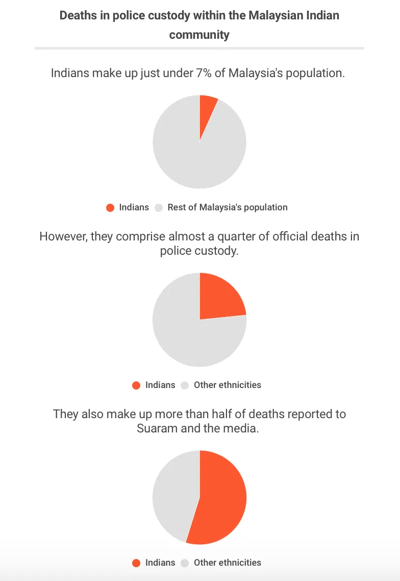 According to non-governmental organisation (NGO) Suara Rakyat Malaysia, (which translates to “voice of Malaysian citizens” and more generally referred to as SUARAM), nearly 55% of police custodial deaths involving the Indians have been confirmed.