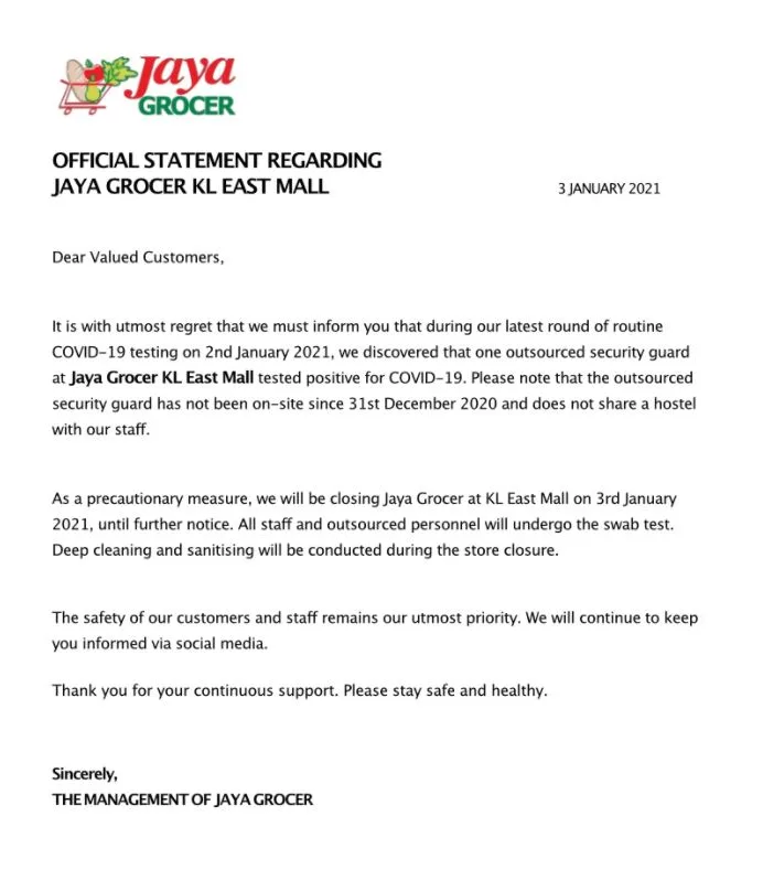Followed by this, yesterday (3rd January) Jaya Grocer at the newly launched KL East Mall Outlet was closed down due to a confirmed COVID-19 infection involving a security guard.