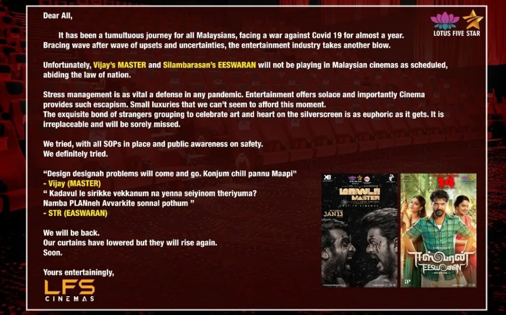 In Malaysia with the announcement of the MCO in the six states inclusive of Selangor and Wilayah Persekutuan (Kuala Lumpur) yesterday, Lotus Five Star released an official statement on their social media handles pertaining to the release of “Master” and “Easwaran”.