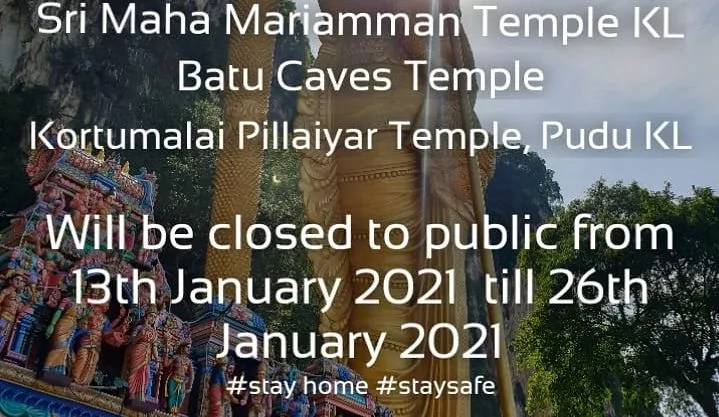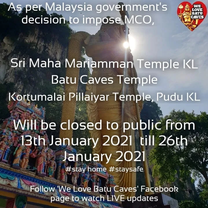 The move comes in light after MCO 2.0 was declared on Monday (11th January) by Prime Minister Tan Sri Muhyiddin Yassin to tackle the increasing number of national Covid-19 infections. As recommended by the authorities, the temples will be closed to the public, tourists, and devotees from 13th January to 26th January.