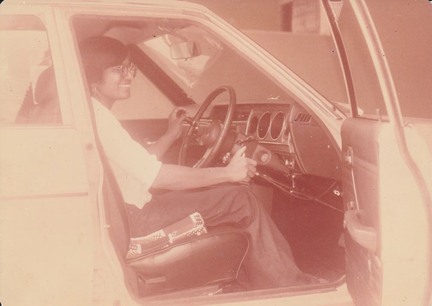 Her Datsun 120Y was the first car in our country to be operated by hand. She uses her right hand to operate the pedals and her left hand to steer.