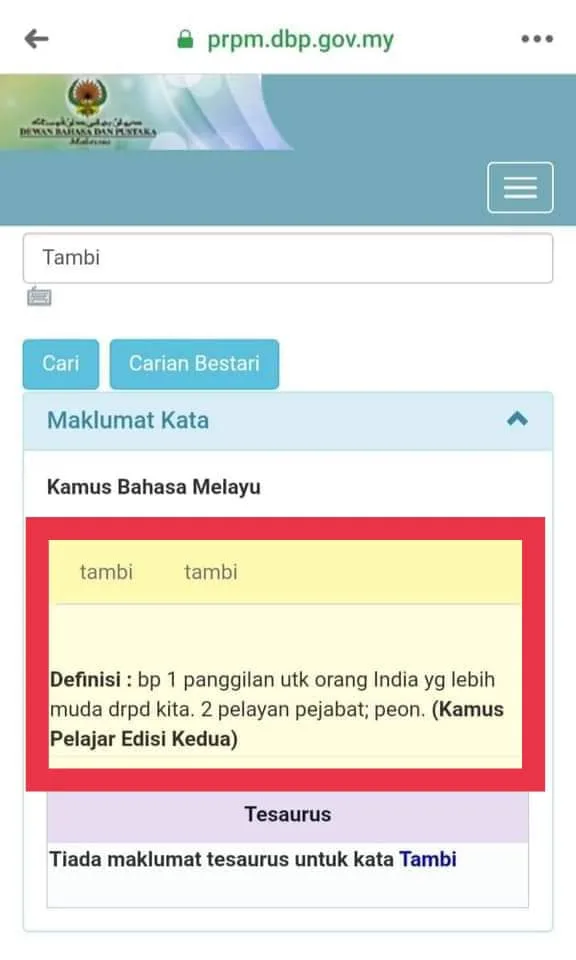 The controversial definition appears when a search for the word tambi is defined as “panggilan utk orang keling yang lebih muda daripada kita” (term used to refer to a keling person younger than ourselves). As per our Indian callings, tambi is an affectionate Tamil word which means “little brother,” addressing a younger Indian male.