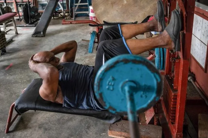 The father of seven children preserves his fitness by eating well in addition to working out daily. His gym is crammed with rusty weights and a number of other equipment, some of it scrap metal, and it’s still bustling with men pumping iron and receiving fitness advice from the seasoned bodybuilder.