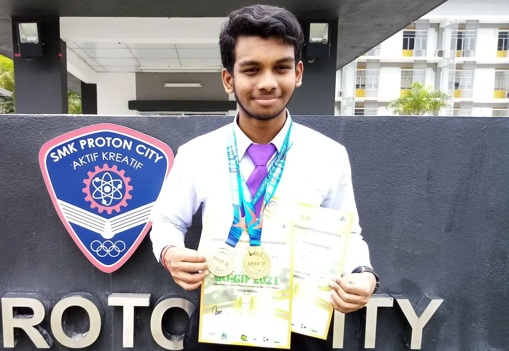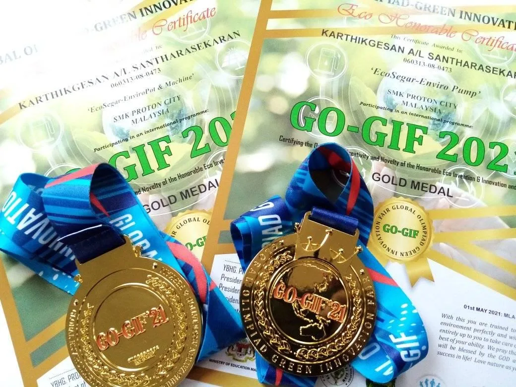 Yet, an amazing accomplishment came after Karthikgesan Santharasekaran from Sekolah Menengah Kebangsaan (SMK) Proton City clinched two gold medals at the Green Agricultural Innovation and Green Engineering categories of the Global Olympiad Green Innovation Fair (GO-GIFT 2021) competition!
