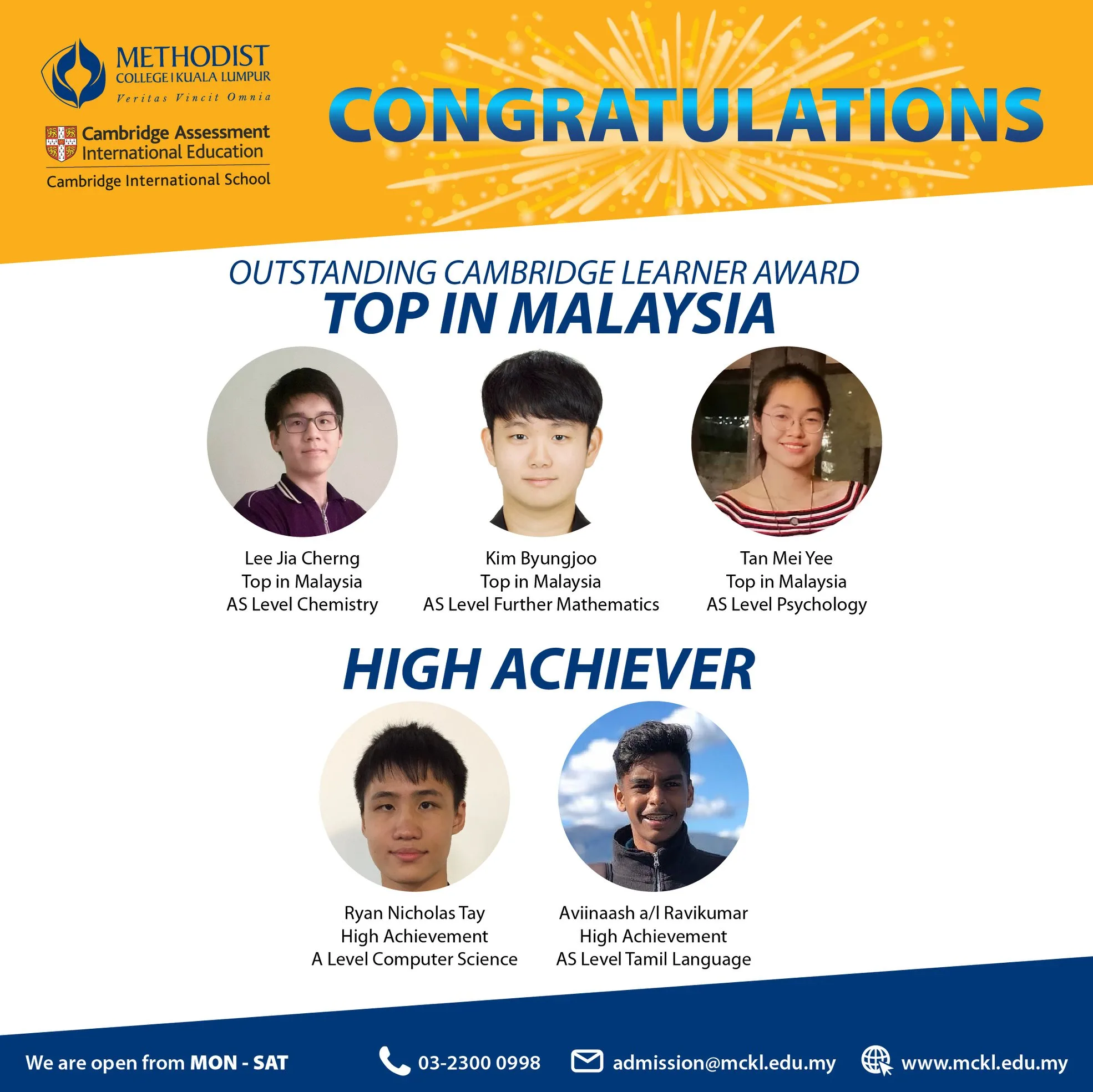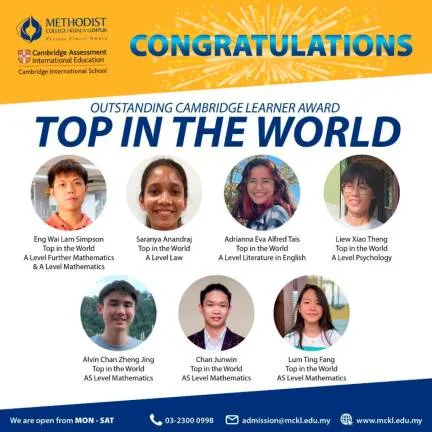 Seven out of twelve students from Methodist College Kuala Lumpur (MCKL) have excelled by achieving the ‘Top in the World Awards’ widely renowned as the Outstanding Cambridge Learner Awards.
