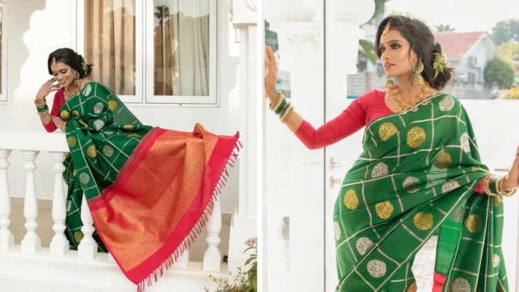 The elegance of the Kanchievaram silk saree is a work of art in and of itself. Isn’t the contrast in the saree she’s donning arresting your gaze?