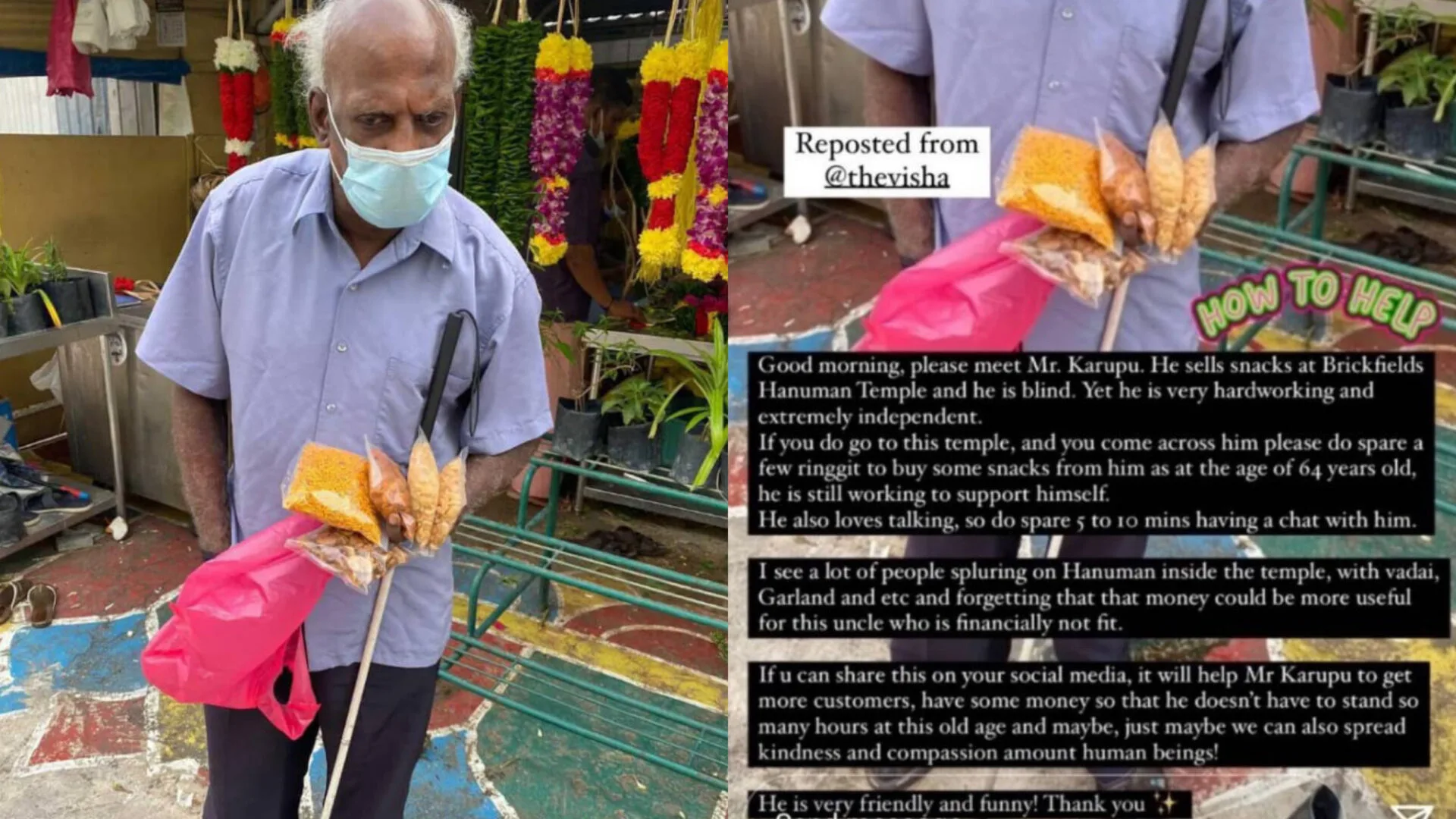 Uncle Karuppu, who sells snacks outside Sree Veera Hanuman Temple in Brickfields happens to be one of them. He is blind yet a very hardworking and extremely independent person.