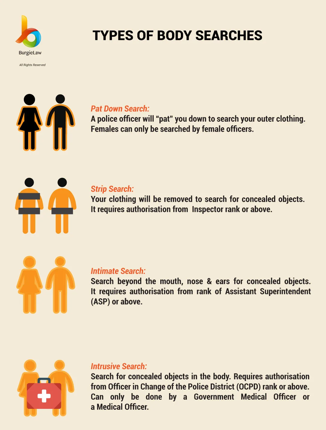 The Police have power to search your body for any object relating to the suspected offence. A female can only be body searched by a female Police Officer. And the most important thing is there is no law requiring you to strip naked.