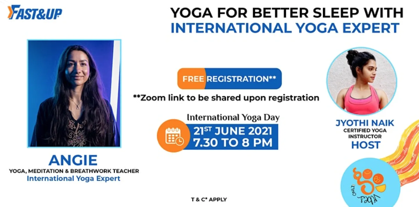 Fast&Up’s International Yoga Expert Angie will lead us through a guided Yoga Session on International Yoga Day, demonstrating various asanas that may help you sleep better. The workshop will be moderated by host – Jyothi Naik (Certified Yoga Instructor).