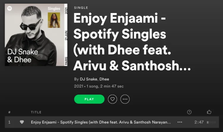 Dhee’s ‘Enjoy Enjaami’ has been released on Spotify by French record producer William Grigahcine, famously known as DJ Snake who earned a Grammy nomination for ‘Album of the year’ in 2012 for producing Lady Gaga’s 2011 album ‘Born This Way’.