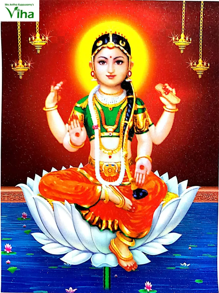 In the makeover, she is shown with four arms and a red circle on each palm. Two of her arms are holding a sacred textbook and a japamala. Balaambigai is considered and acts like a child, but she is said to bring true knowledge, education, wisdom, power, and prosperity for a better life.