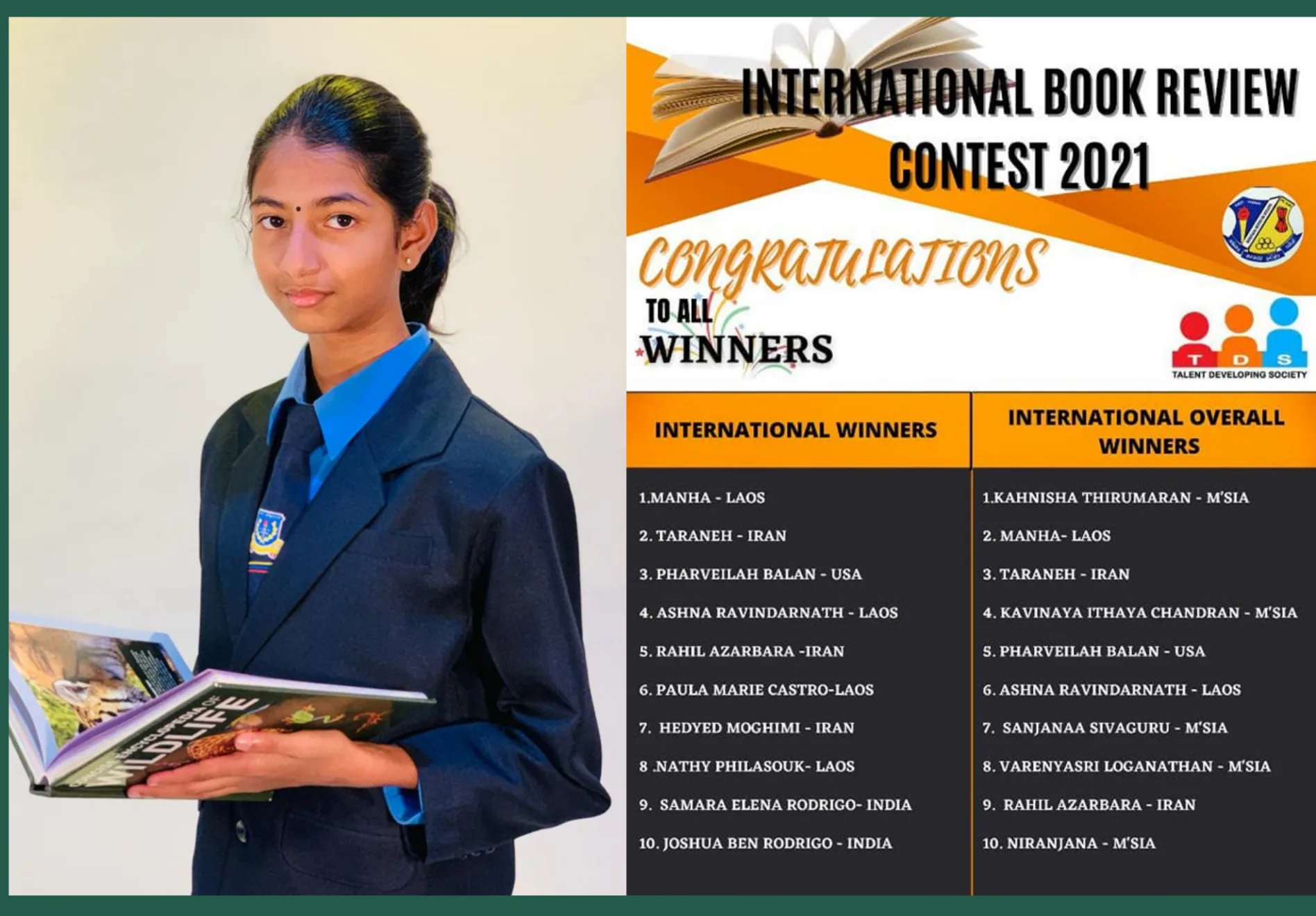 Kahnisha Thirumaran bagged the Nilam Award for the International Book Review contest 2021 under the Nilam programme, held annually.