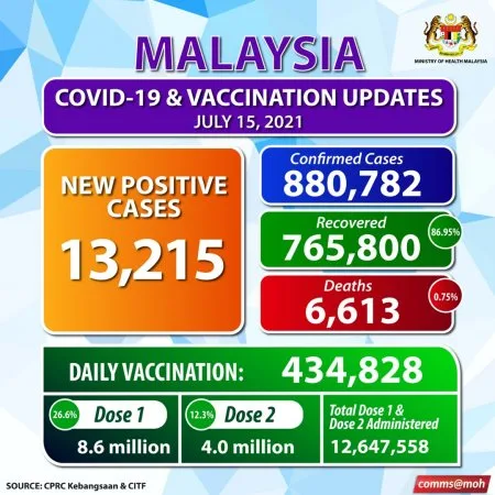 Malaysia reported 13,215 new COVID-19 cases on Thursday (15th July), bringing the total infections in the country to 880782,533, with a total of 6,613 deaths. Meanwhile,computer shops, telecommunication devices, books, and stationery shops are allowed to operate across the National Recovery Plan (NRP).