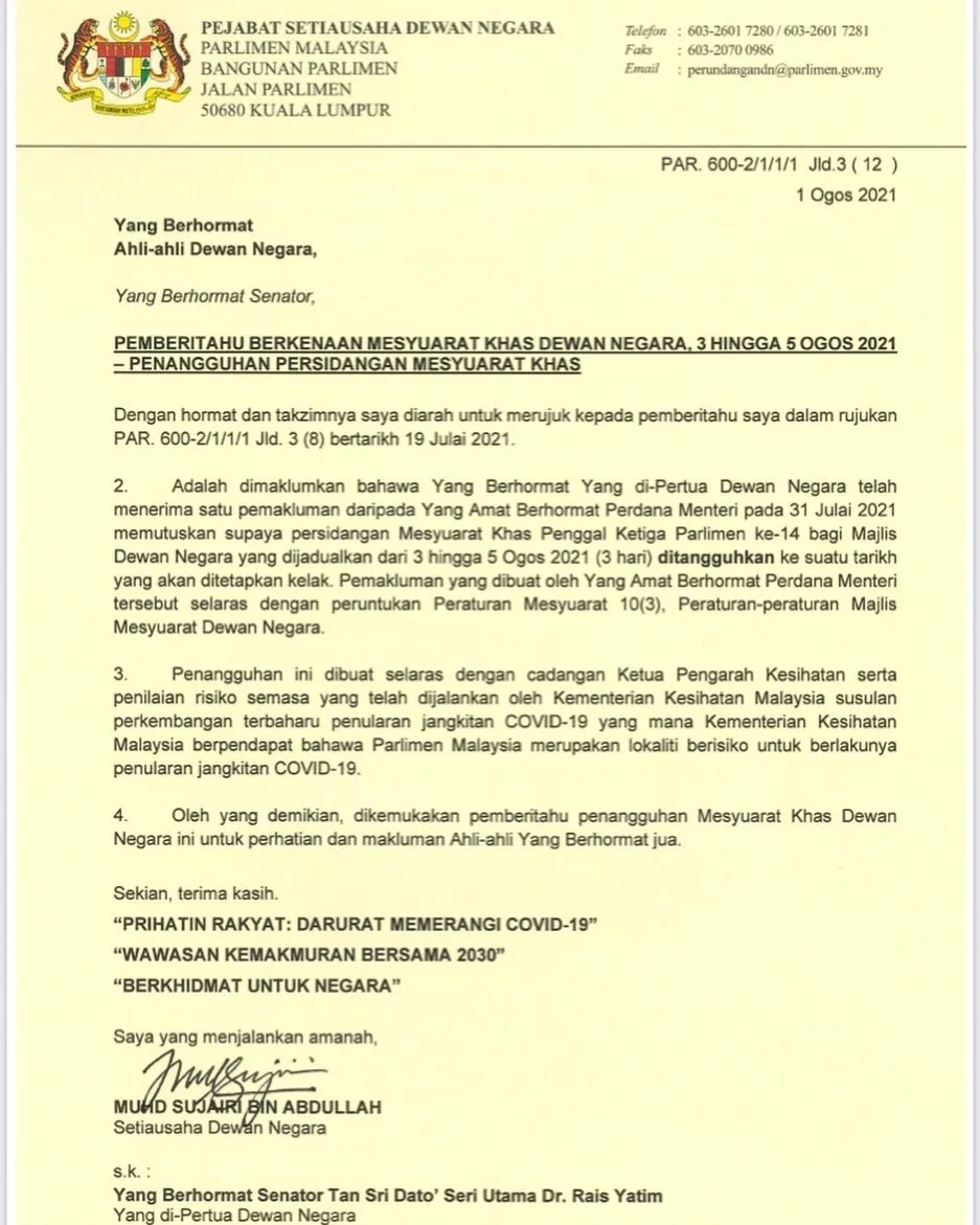 The Dewan Negara sitting was scheduled to take place from the 3rd to the 5th of August, but it has been postponed due to recommendations from the health director-general and a risk assessment conducted by the health ministry in response to the spread of Covid-19 infections.