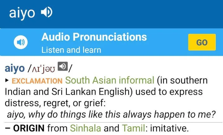 The word “Aiyo” was added to the Oxford English Dictionary five years ago, in 2016 with a description of “In southern India and Sri Lanka, expressing distress, regret, or grief; ‘Oh no!’, ‘Oh dear!'”— is being taken to task for being “pithy,” “emasculating all [the word’s] colorful possibilities,” “reduc[ing] it to cud,” and “suck[ing] the life out of it”.