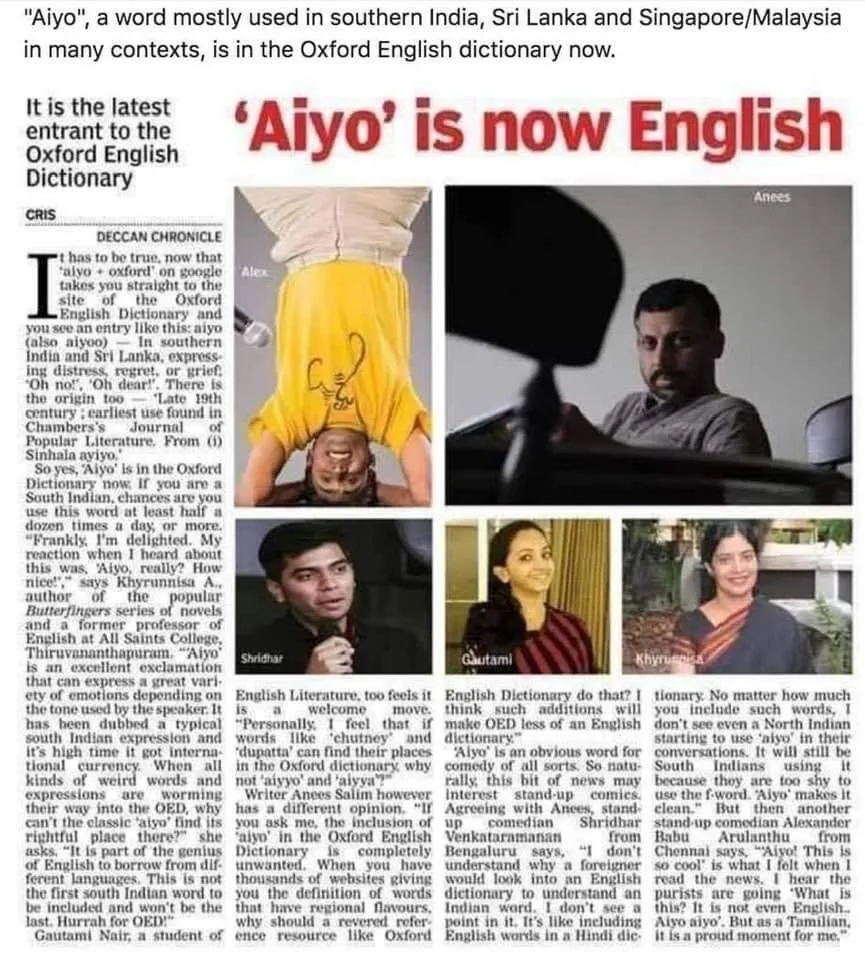 Yes, most of us were unaware of this because “aiyo” was quietly inducted into the dictionary in 2016. Only a few Indian news outlets, such as The Indian Express, covered this story.