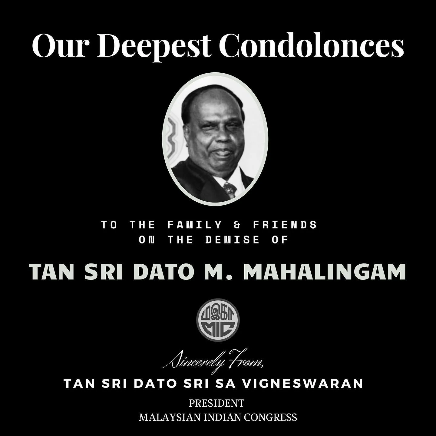 Tan Sri M.Mahalingam, the former Vice President of the Malayan Indian Congress (MIC), succumbed to COVID-19. His health deteriorated yesterday (16th Aug) and passed away at 12.45 pm. He was 86.