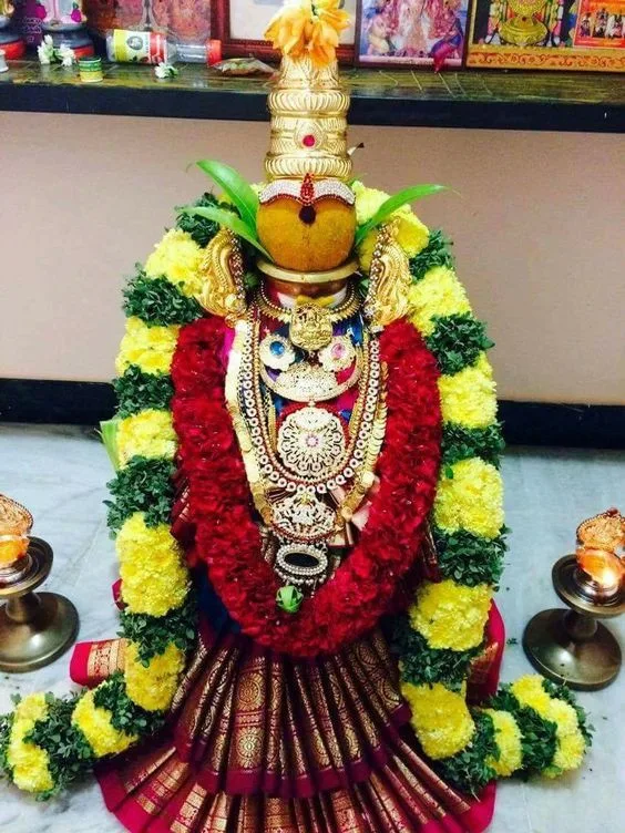 We can perform Varalakshmi pooja, in which we offer flowers, sweets, and fruits to the goddess, known as Vayana. A brass pot, known as the ‘kalash,’ representing the goddess, is wrapped in a saree and filled with rice or water, coins, betel nut, and five different types of leaves.