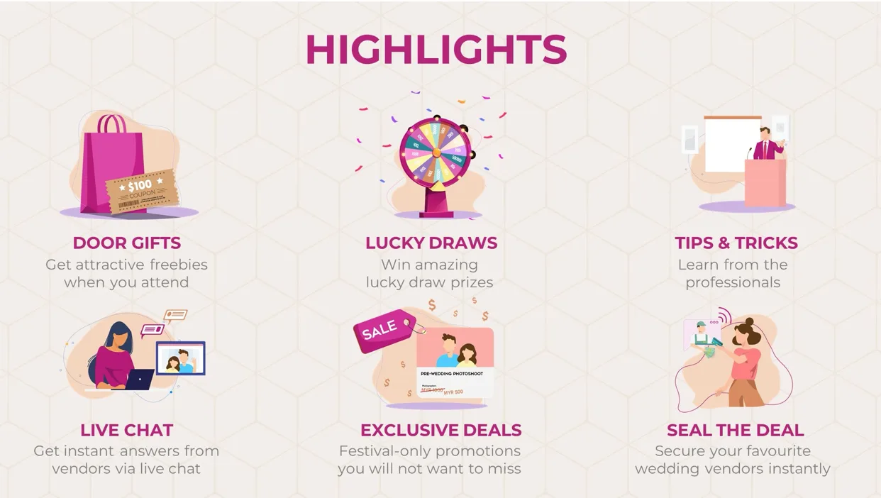Following three successful iterations of the Virtual Wedding Festival in Singapore, the event aims to transport the typically offline wedding fair experience to the virtual world by allowing attendees to browse, compare and book wedding services within the online space.
