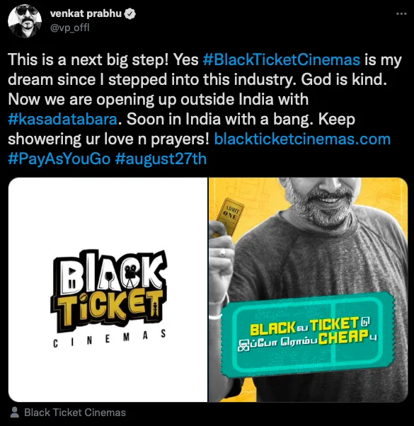 Joining the market players is none other than the well-known Director in Kollywood Venkat Prabhu, A well-known film-maker in the South Indian film industry and known for making blockbusters such as Chennai 600028, Mankatha, Saroja and others; which us as the audience are still able to resonate; has now taken his passion for cinema a step further by launching a new OTT platform called BlackTicketCinemas.com. This brainchild of Venkat Prabhu was developed by Hangover Media Technologies Pvt. Ltd. and is available at www.blackticketcinemas.com as well as the Google Play Store.