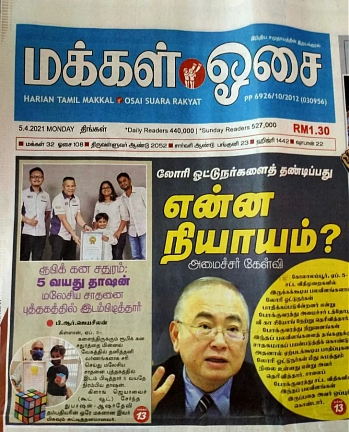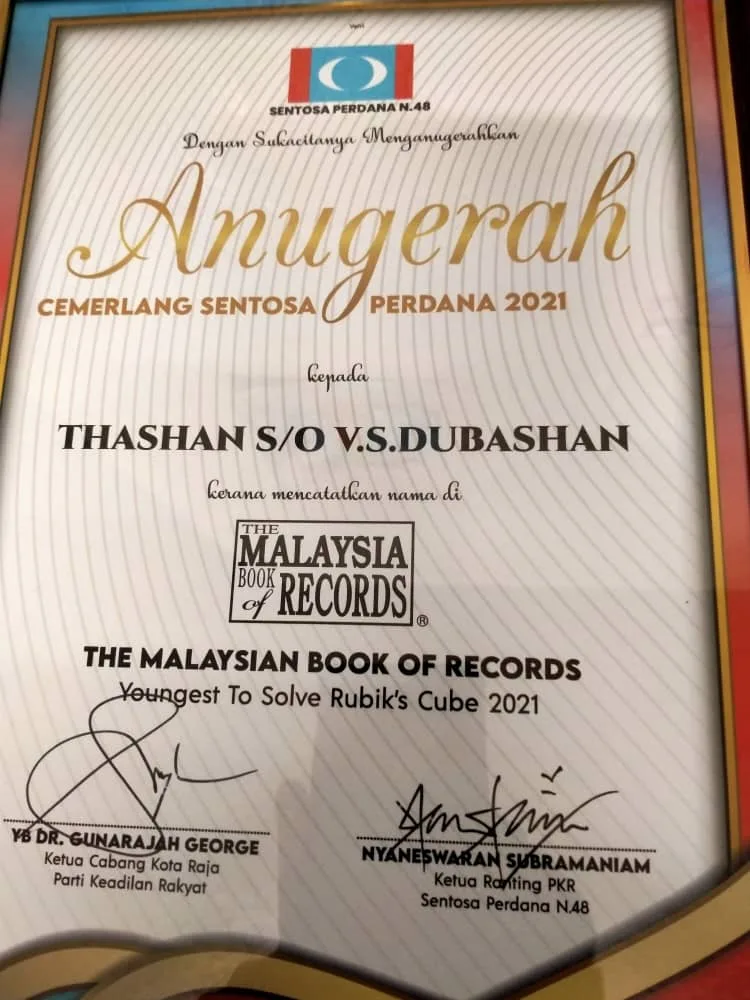 H&D: Next level of solving rubik’s cube, we leave it to his interest as always. Thashan is also learning to solve 4×4 and 5×5 cube. We will be there to support him for his future Guinness World Records. Thashan has also bagged Anugerah Cemerlang Sentosa Perdana 2021 from YB Dr Gunarajah George, Ketua Cabang Kota Raja PKR, and was featured in the Makkal Osai newspaper.