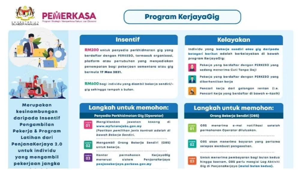 The government has introduced KerjayaGig Program formed under Program Pemulih (Pakej Perlindungan Rakyat dan Pemulihan Ekonomi), to help workers cope with the loss of employment by providing immediate financial and job search assistance.