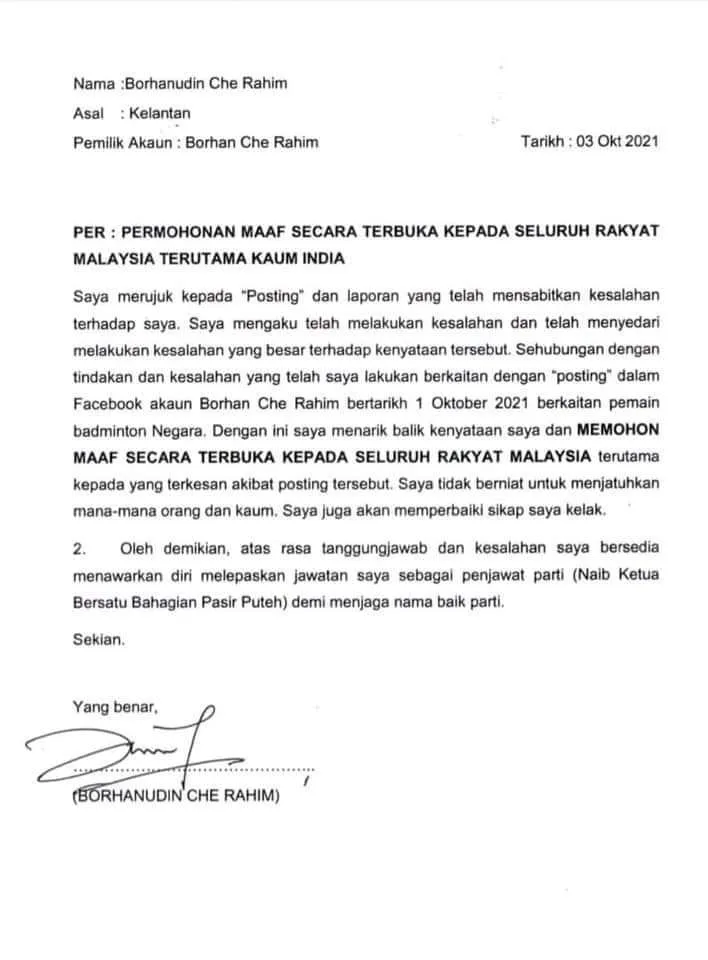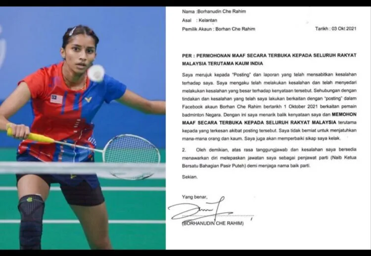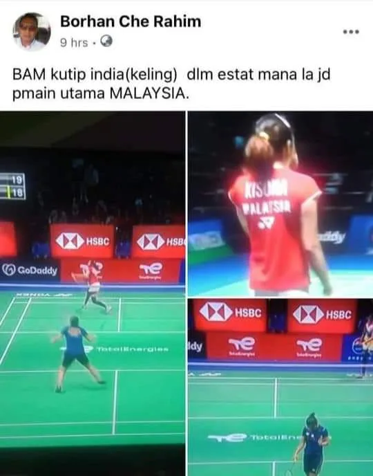 A Facebook user Borhan Che Rahim, who is also Bersatu’s Deputy Chief for its Pasir Puteh division in Kelantan has landed himself into hot water after his racially-charged remark toward our national women’s singles shuttler Kisona Selvadurey sparked anger amongst fellow Malaysians.