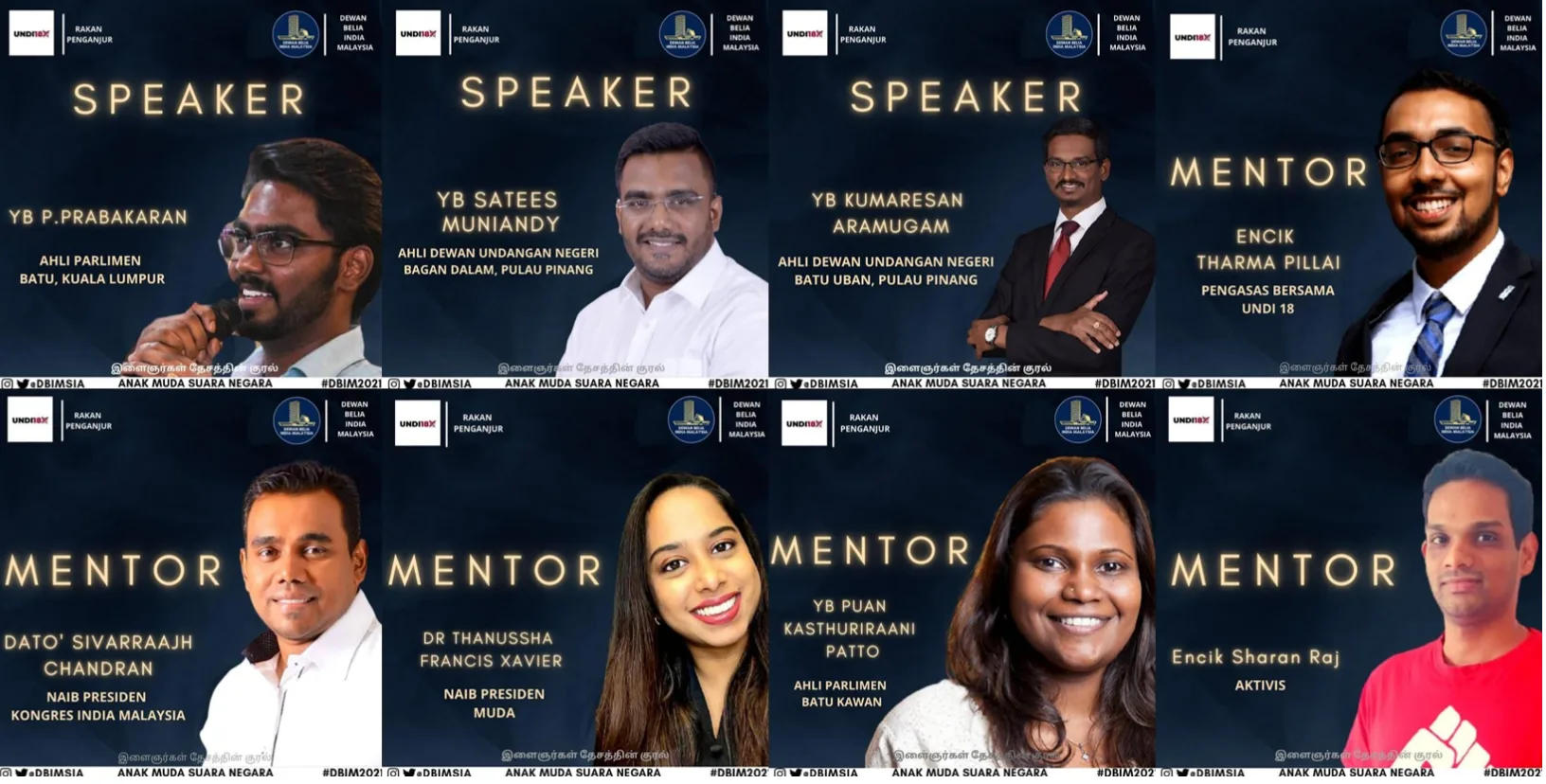 To date the programme has also received support from several organisations such as Architects of Diversity (AOD), Project 57, Gerakan Belia Se-Punjabi Malaysia (GBSM) and others. A total number of 8 leaders and activists of the Indian community including YB P. Prabakaran, Mr. Tharma Pillai, YB Kasthuriraani Patto, Mr. Sivarraajh, Mr. Sharan Raj, and Dr.Thanussha Francis Xavier collaborated together in the programme to assist the 70 delegates during their mentoring sessions and preside the conferences during Dewan Belia India Malaysia.