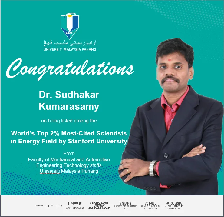 Known as one of the dedicated lecturers, Dr. Sudhakar Kumarasamy was honored among the Stanford University list for his research excellence in the “Energy” field. The list includes over 150,000 scientists whose works have been cited the most by researchers around the world in influential journals, making them the world’s most prominent scientific researchers.