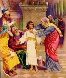 They return to search for him, and three days later, they find him at the temple, communicating with the religious teachers.