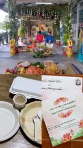 For their wedding, biodegradable plates and cutlery made of Areca leaves (Pakku Mattai) and corn starch, photodegradable plastic bags including a serving of a 16-course wedding meal on banana leaves, and even developing and printing plantable wedding invitations were among the “green” initiatives taken at the wedding.