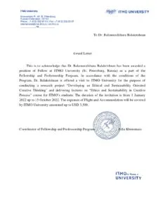 Dr Balamuralithara Balakrishnan, a professor and researcher who hails from Ipoh, Perak had recently received international recognition after being appointed for a fellowship position at the ITMO University, Russia which happens to be one of the prestigious universities in Russia specifically in the area of Educational Creative Studies.