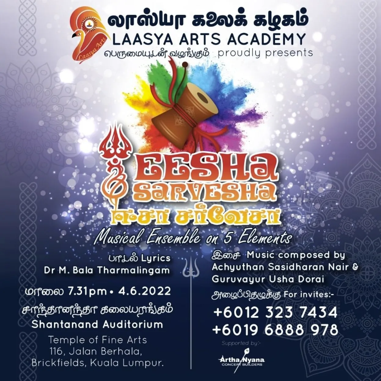 Laasya Arts Academy will be conducting a beautiful musical rendition aptly titled Eesha Sarvesha on the 4th of June at 7.31pm at Shantanand Auditorium, Temple of Fine Arts. Laasya Arts Academy is a fine arts organisation that promotes and preserves the ancient classical music & dance forms of India.