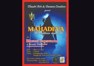 A Carnatic vocal recital aptly titled Mahadeva, The Endless Devotion accompanied by eminent artists will be held on 14th May 2022, at Kanagasabai Hall, Temple of Fine Arts, Kuala Lumpur at 7:01pm. This recital is presented by Dhaatri Arts and Damaru Creations.