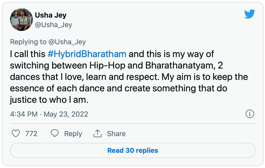 Usha named the dance form as #HybridBharatham, and explained that it was her style of alternating between hip-hop and Bharathanatyam which are her two favourite dance. She further said that the goal was to recapture the magic of each dance and create something that represented who she was.