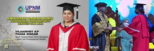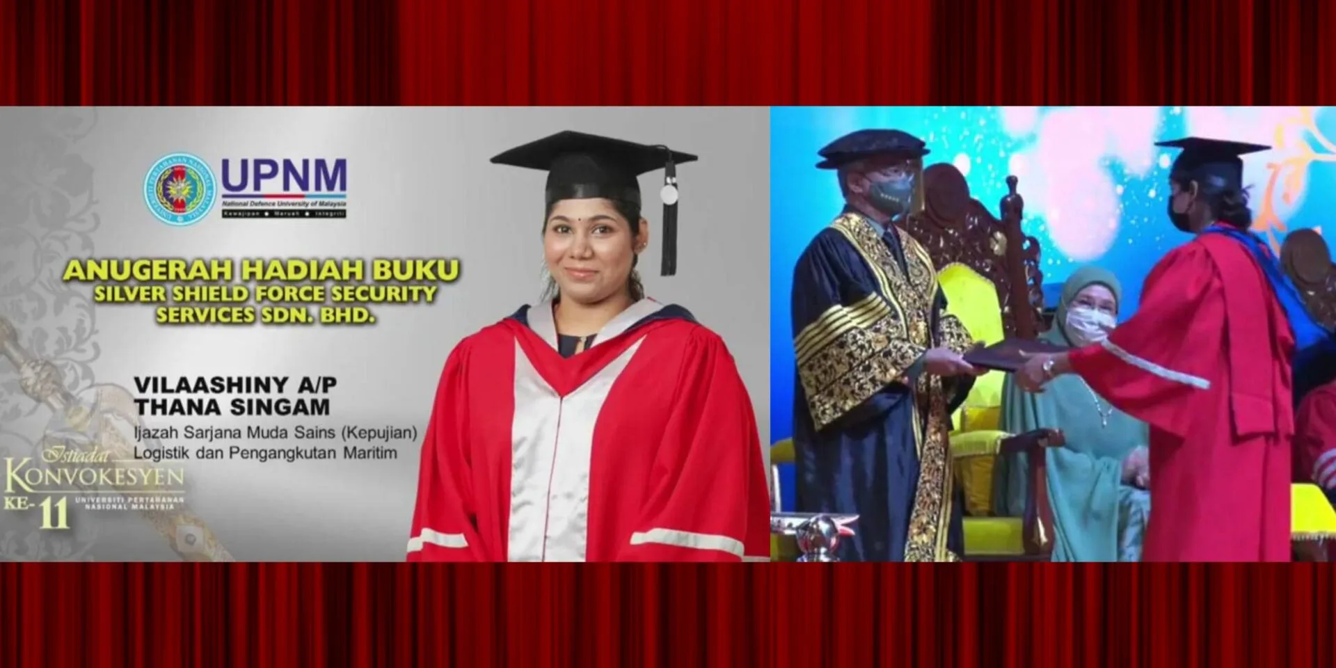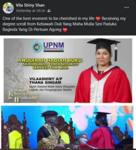 According to Vilaashiny, she is the one and only Indian student who received the award for this category from Yang di-Pertuan Agong during the 11th Convocation Ceremony of Universiti Pertahanan Nasional Malaysia which was held at the Putra World Trade Centre (PWTC).