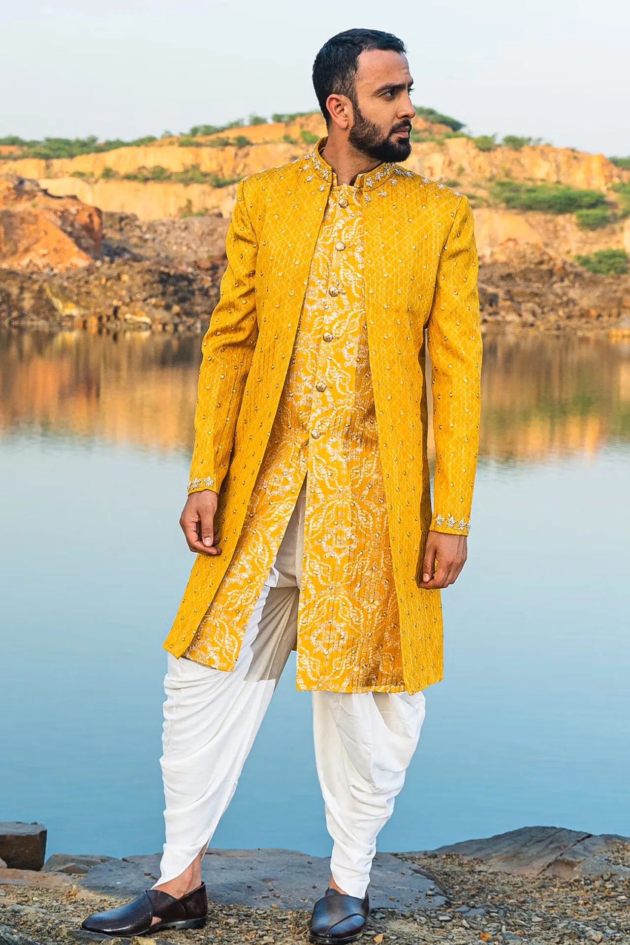 Amp up your dhoti kurta by adding a long jacket to the ensemble.