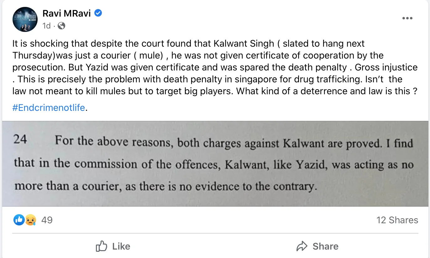 “This would then mean that the administration of justice concerning the death penalty has been brought into disrepute, thereby declaring all executions unconstitutional,” Ravi started in his Facebook post.