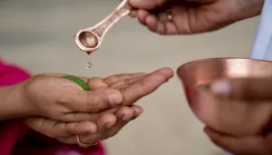 Commonly, after prayer there would be offering of “theertham” from priest. The holy water was preserved for hours in a copper vessel and contains milk or water dipped in Thulasi leaves. As per Ayurveda, water kept in a copper vessel has the power to balance three doshas (vata, kapha, and pitta) in your body by positively charging in the water. Your taste buds would be stimulated by drinking it from copper vessel. Additionally it could treat various health issues like fever, cough, sore throat, etc.