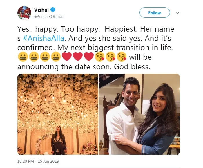 Vishal reciprocated with a tweet. The actor is visibly estatic about his big day, also sharing two pictures of his beau, before saying that he will reveal his wedding date soon.